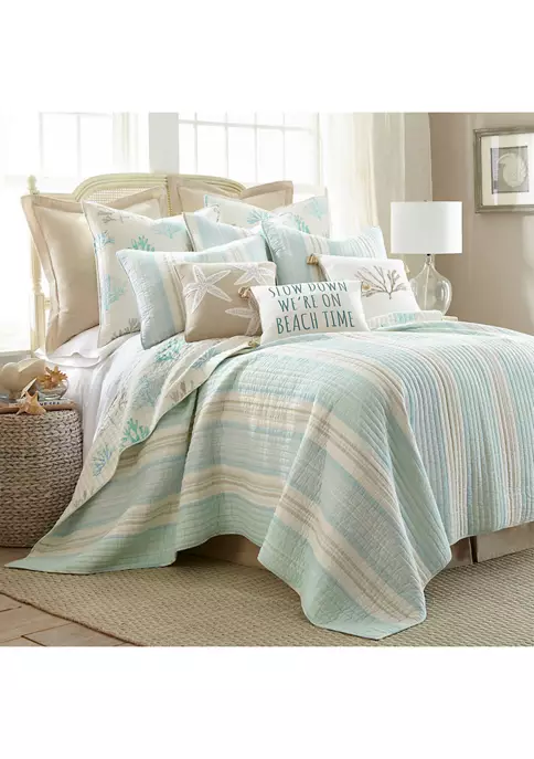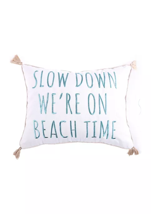 The Beach Time decorative pillow matches perfectly with the Levtex Home Kapalua Bay bedding collection. This pillow is sized at 14x18in. and features the words SLOW DOWN, WE’RE ON BEACH TIME embroidered in light blue thread on a white canvas ground with a beige border and corner tassels in complement. The cool, coastal color palette makes this a versatile accessory for your bed, couch or favorite chair. The pillow comes pre-filled with a luxurious feather inner.