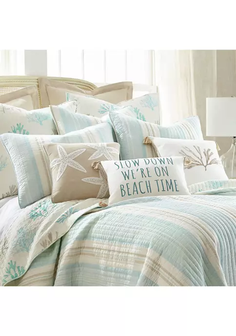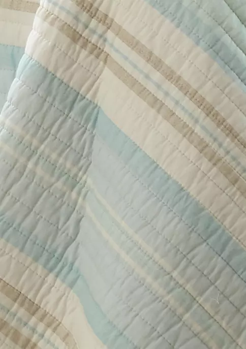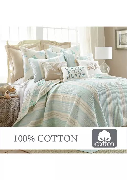 The Stone Harbor Reversible Full/Queen Quilt by Levtex Home is inspired by a relaxing tropical vacation. This cream, taupe and blue design will immediately transform your bedroom. Made with the softest lightweight cotton, this reversible quilt features a simple stripe design in taupe, cream, and varying shades of light blue, reversing to coral tossed in various styles and coastal colors on the other. The Full/Queen Quilt Set include a Full/Queen Quilt 88x92in. and two Pillow Shams 20x26in. and is machine washable. Enjoy this for years to come!