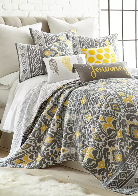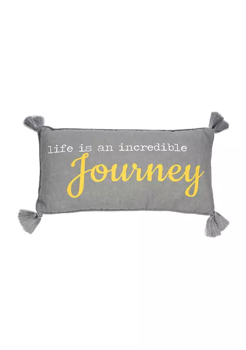 The Taryn Gray Journey Pillow adds an agreeable message reminder to your home dΓ©cor. This pillow is sized at 12 inches by 24 inches and features the sentiment LIFE IS AN INCREDIBLE JOURNEY in white and yellow print on a gray ground. The sophisticated color palette makes this a versatile accessory for your bed, couch, or favorite chair. The pillow comes pre-filled with a soft luxurious feather inner.