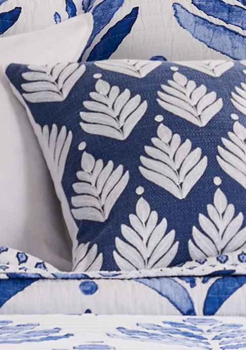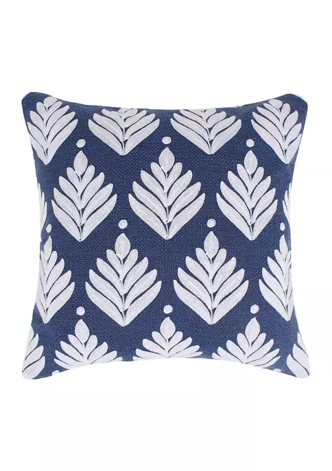 The Embroidered Leaves decorative pillow matches perfectly with the Levtex Home Vintage Blossom bedding collection. This pillow is sized at 18x18in. and features an array of delicately embroidered fan leaf icons on a blue ground. The blue and white color palette makes this a versatile accessory for your bed, couch or favorite chair. The pillow comes pre-filled with a soft, luxurious feather inner.
