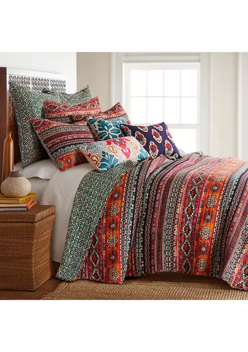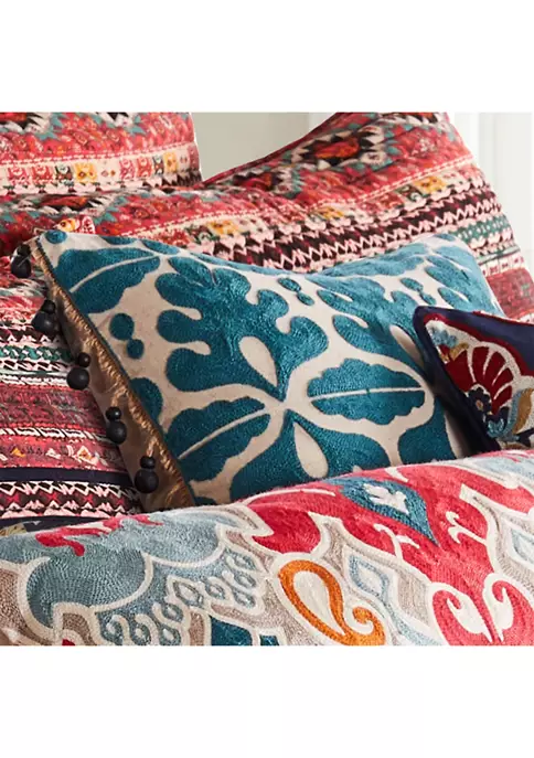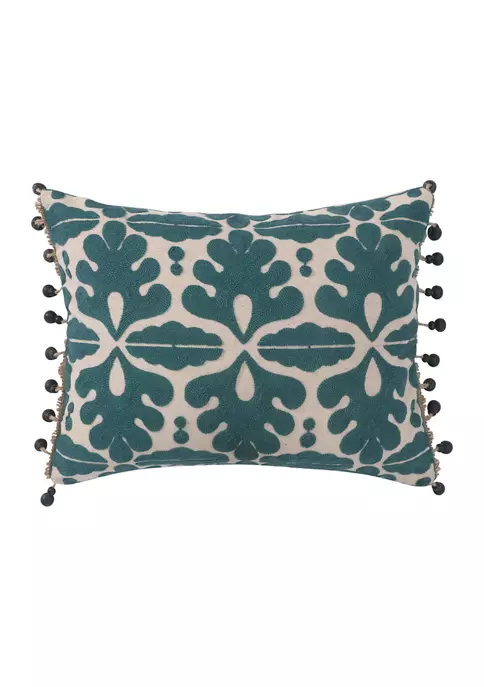 The Tribal Print Decorative Pillow complements the Vista bedding collection. Use it to accessorize your bed or on your living room couch or favorite chair. This pillow features a fun tribal pattern in teal richly embroidered in crewel stitching on a natural ground edged with beads.