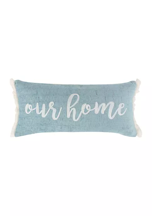 The Our Home decorative pillow matches perfectly with the Levtex Home Wentworth bedding collection. This pillow is sized at 12x24in. and features the words OUR HOME embroidered on a baby blue sweater ground with the sides lined with white tassels The color palette makes this a versatile accessory for your bed, couch or favorite chair. The pilow comes pre-filled with a soft. luxurious feather inner.