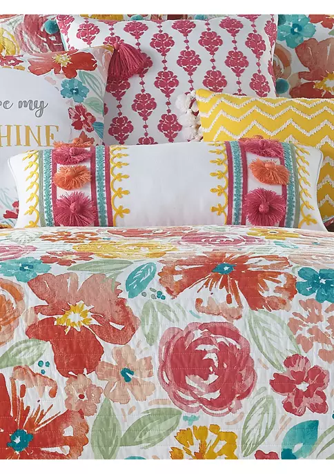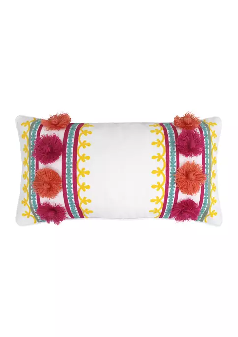 The Pom Pom decorative pillow matches perfectly with the homThreads Leora bedding collection. This pillow is sized at 12 inches by 24 inches and features bright bands of embroidery on each end of the pillow punctuated by vibrant pom-poms. The color palette makes this a versatile accessory for your bed, couch, or favorite chair. The pillow comes pre-filled with a soft luxurious feather inner.