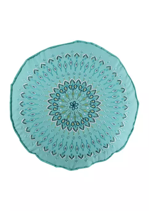 The Mirage Teal Round Pillow by Levtex Home is a lovely accent to the Mirage bedding collection with a stylish round shape decorated with a stunning mandala print in shades of vibrant teal. Pre-washed and luxury oversized with an invisible zipper, this 18-inch round pillow comes with a compressed duck feather insert.
