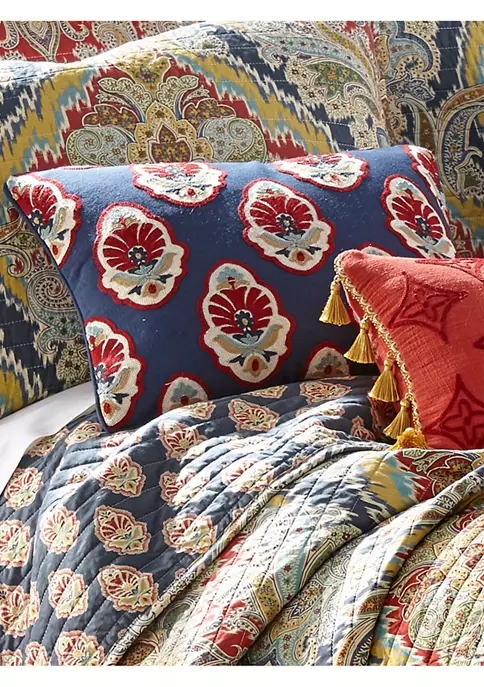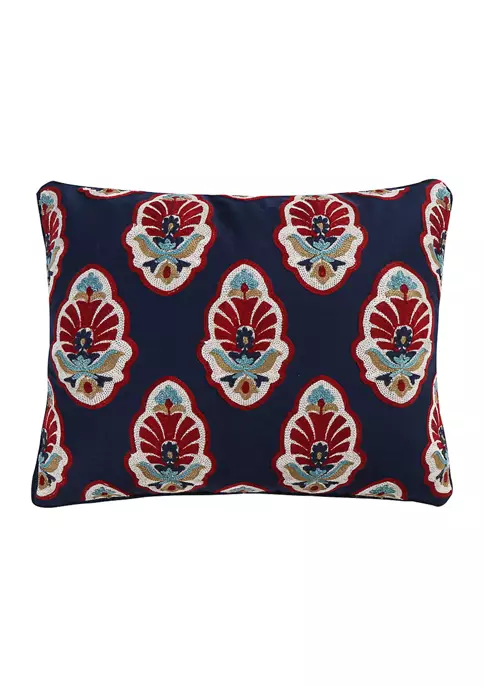 The Embroidered Damask Decorative Pillow matches perfectly with the Levtex Home Moreno bedding collection. This pillow is sized at 14 inches by 18 inches and features a rich blue fabric embroidered with a repeating detailed damask pattern. The sophisticated color palette makes this a versatile accessory for your bed, couch, or favorite chair. The pillow comes pre-filled with a soft luxurious feather inner.