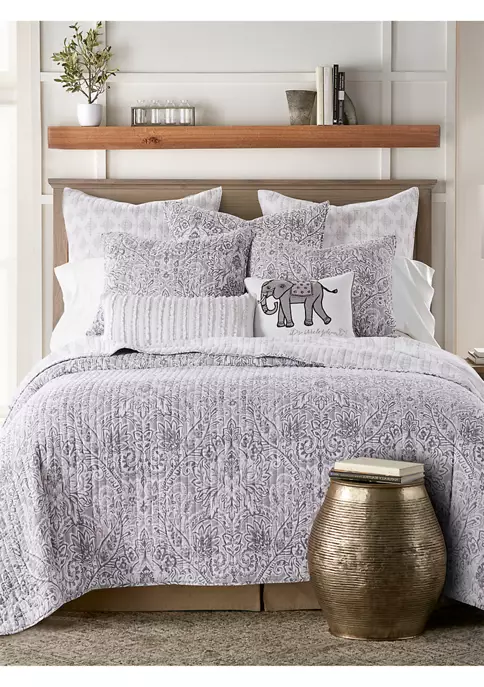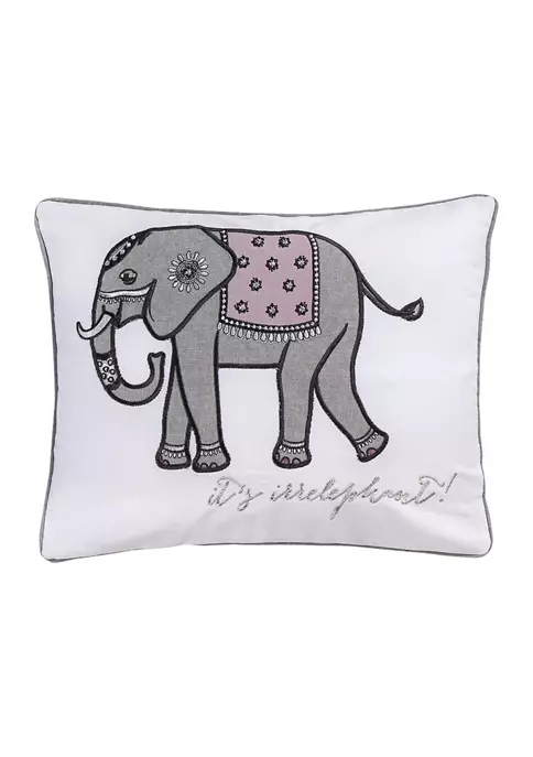 The It’s Irrelephant! Decorative Pillow matches perfectly with the homThreads Rachelle bedding collection. This pillow is sized at 14 inches by 18 inches and features beautifully detailed elephant appliquΓ©d in gray and lavender on a cream canvas ground, piped in gray. The color palette makes this a versatile accessory for your bed, couch, or favorite chair. The pillow comes pre-filled with a soft luxurious feather inner.
