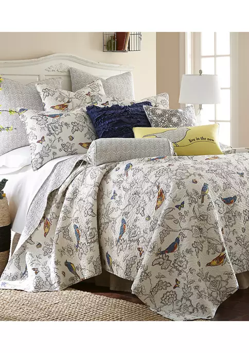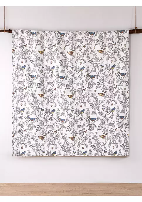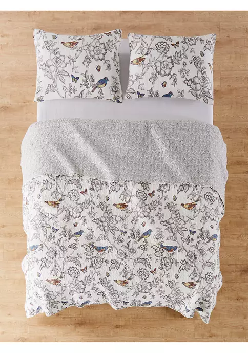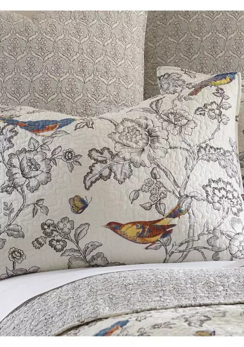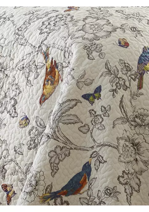 Dress your bedroom in the sophisticated Sheridan Quilt Set, featuring a modern update to the classic toile pattern with a floral print in black and white accented with colorful birds and butterflies. The quilt reverses to a decorated trellis pattern.