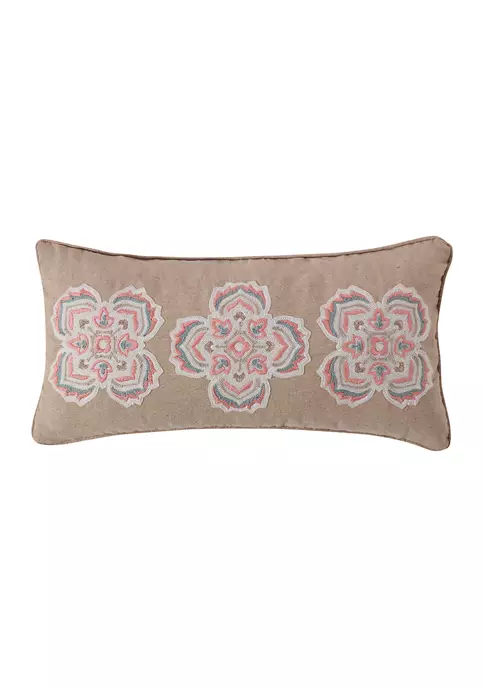 The Levtex Home Spruce Coral Crewel Medallions Pillow includes a duck feather insert with a decorative pillow 12 in x 24 in natural and coral colors. The Spruce Coral collection is calming and stylish, offering a printed paisley pattern in soft blushes and taupe hues to bring an artistic flair to your space.