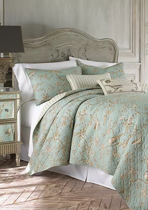 To create the perfect combination of gentle and rich, the Levtex Home Tamir Teal Full/Queen Quilt Set provides a classic and calm print in taupe, on a soft teal ground. The toile pattern lends natural themes of branches, flora, and birds to give this quilt a whimsical and traditional look, all in one. This quality 100% prewashed cotton quilt set will work perfectly in a room with a matching decor scheme, or in a plain room that you want to enrich with a classic and warm pattern to get the job done